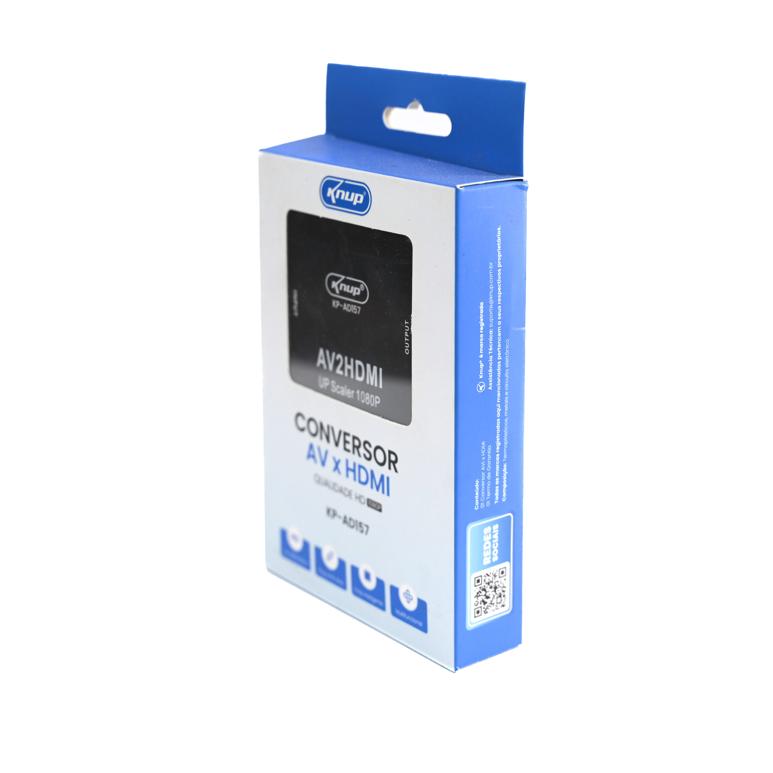 O KPAD157 é um conversor compacto e funcional projetado para conectar fontes de vídeo com saída AV (RCA sinal composto: vídeo + áudio estéreo) a TVs, monitores ou projetores HDMI.